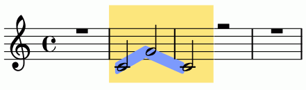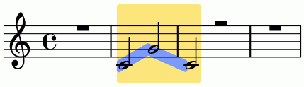 Die blaue Linie, die die Notenköpfe verbindet, besteht aus zweckentfremdeten Clustern. Damit sie die Noten und Notenlinien nicht verdeckt, ist sie in die Ebene "-1" verschoben.
