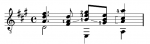 (3) In Mats Barré-Beispiel rutscht die versteckte Stimme rechts neben die Hauptstimmen und positioniert dadurch zum einen die Punkte zu weit rechts und zum anderen (im Falle des ,,cis") im falschen Zwischenraum. Das alles lässt sich aber vermeiden, indem man (a) den versteckten Akkord nur eine Viertel dauern lässt (um den Punktierungskonflikt zu umgehen), (b) den (versteckten) Akkord nach links auf eine Vertikale mit den übrigen Noten zwingt (um die ,,Punktierungspunkte" wieder an Ort und Stelle zu bekommen) und (c) die Halsausdehnung des vorhergehenden Akkords ein wenig nach rechts erweitert, damit die Barré-(Arpeggio)-Klammer nicht zu sehr daran klebt. Bitte nicht böse sein, Mat, weil ich wieder so viel rumningele!